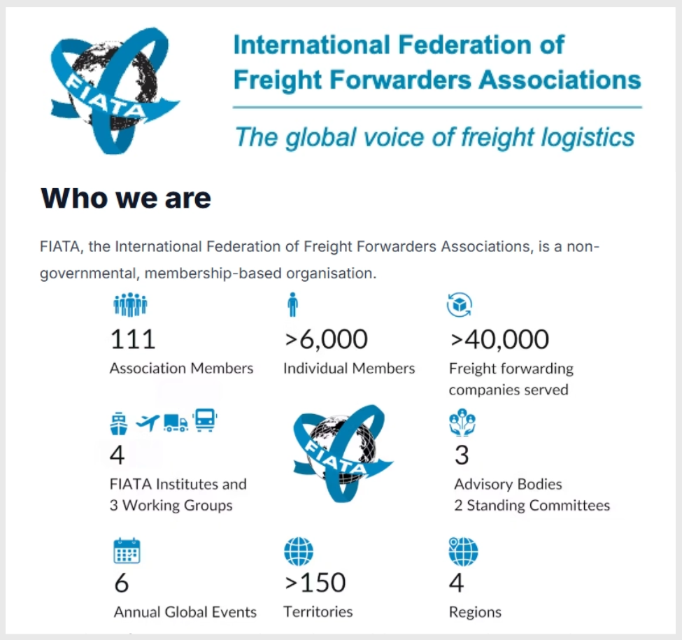 国际货运代理协会联合会(FIATA)成立于1926年,总部位于瑞士苏黎世,被誉为“运输业的联合国”。近百年间,FIATA始终致力于推动全球货运代理行业的规范化、标准化发展,制定行业标准、统一术语规则、协调全球货运代理企业合作,目前FIATA会员网络遍及150多个国家和地区,涵盖111个协会成员及逾6000名个体会员,通过标准制定、机构建设和国际协作,持续推动着全球货运物流行业的发展。
